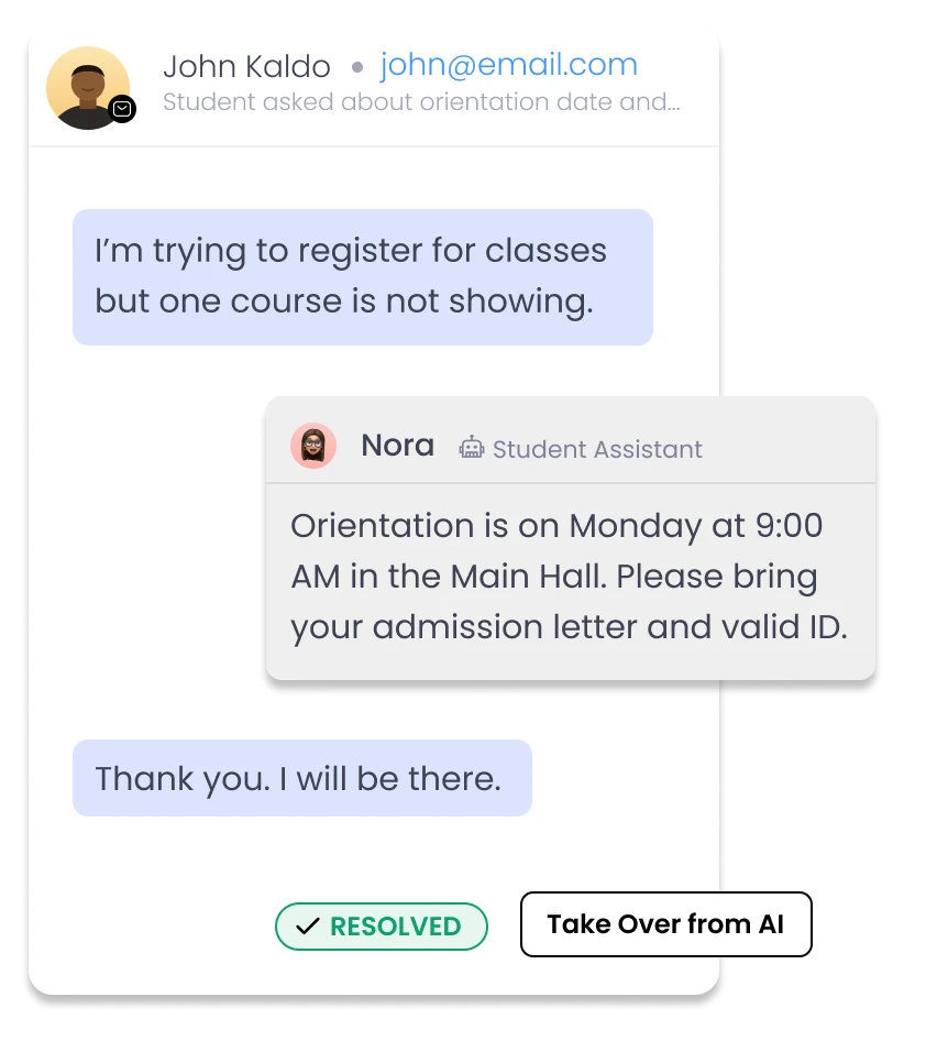 Keep students informed, supported, and engaged with AI that maintains timely conversations and consistent follow-up from first inquiry to admission, orientation, and ongoing support.
